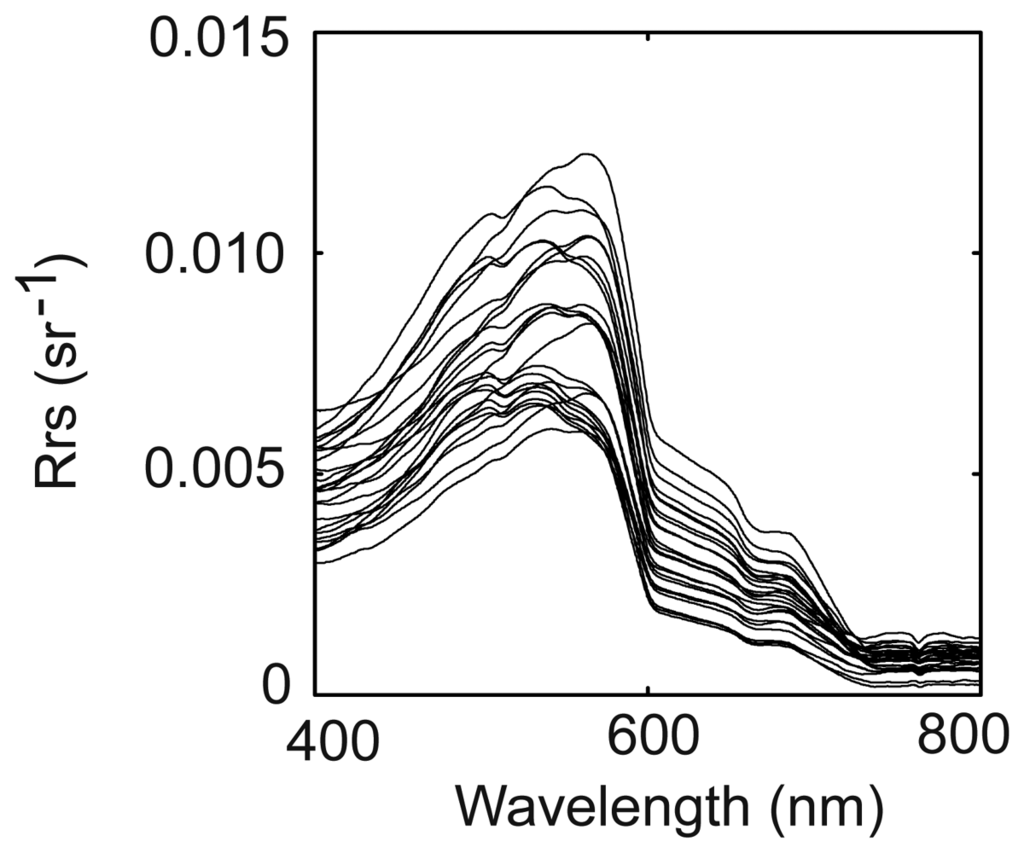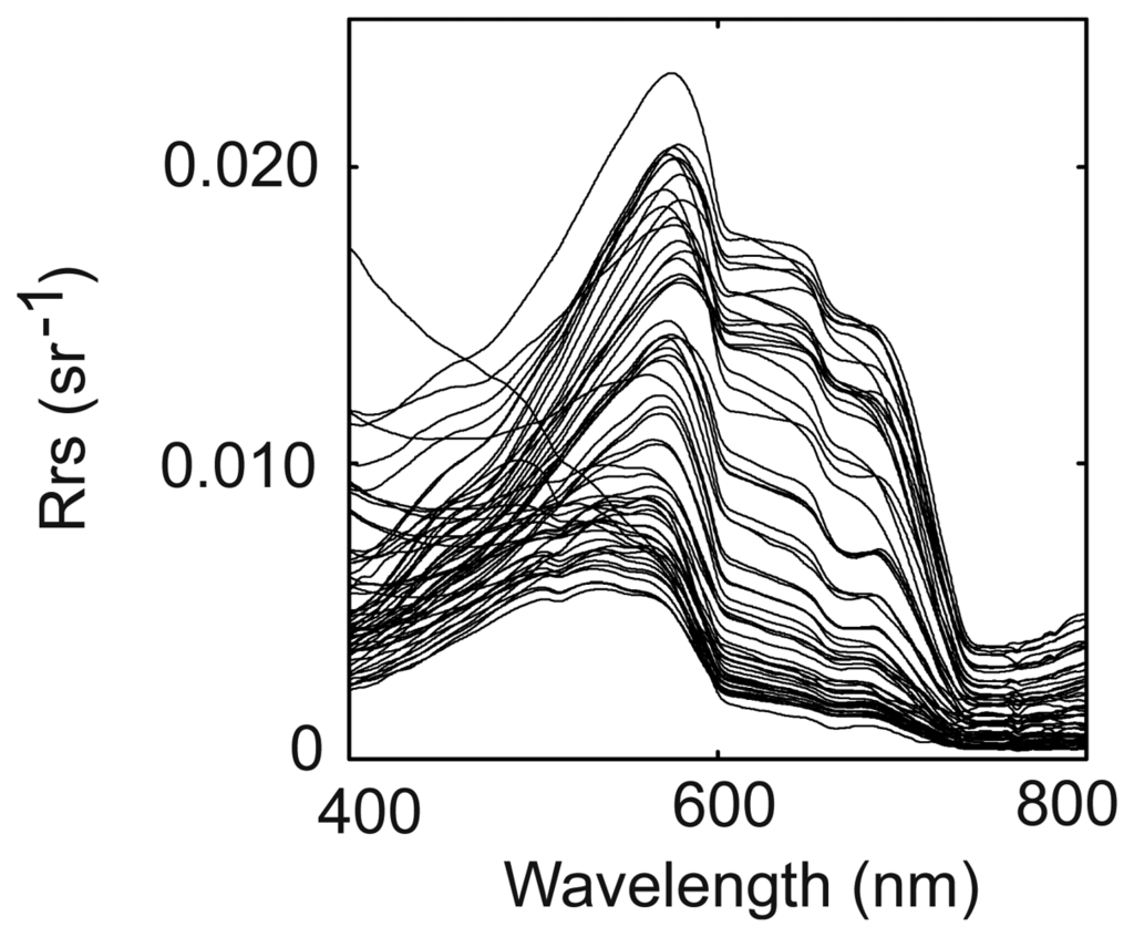 - Doxaran, D.; Froidefond, J.M.; Castaing, P. Remote sensing reflectance of turbid sediment-dominated waters. Reduction of sediment type variations and changing illumination conditions effects by use of reflectance ratios. Applied Optics 2003, 42(15), 2623–2634. [Google Scholar]