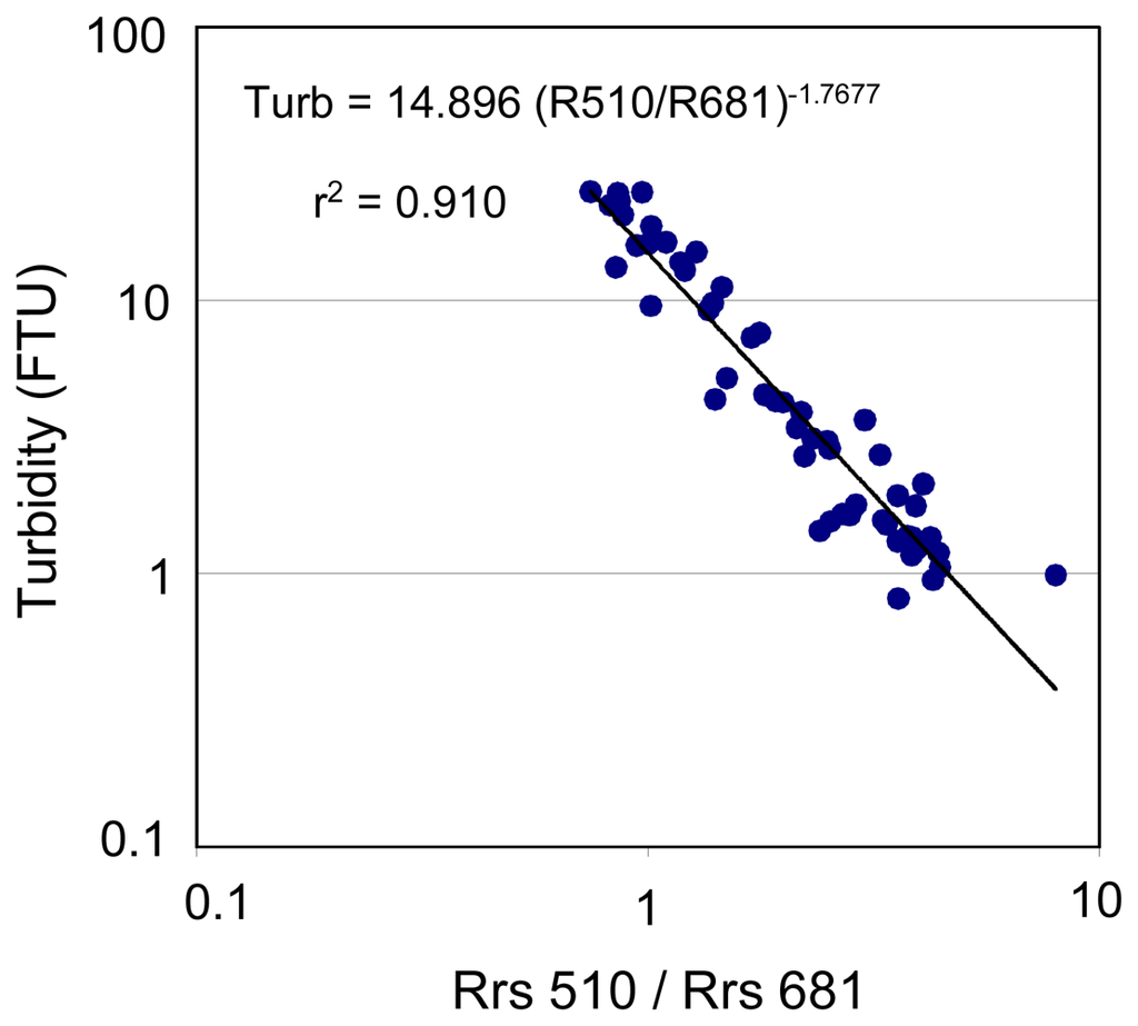 Rrs measurements performed in Fiji are presented in Fig. 6. The best-fit single-band algorithms for turbidity are found based on Rrs620 and Rrs681 (Fig. 7), while the best-fit two-band algorithm is based on R510/R681 following a power model (Fig. 8) (see also Table 2). Turbidity calculated using these relationships shows a mean normalized bias of less than 6% and a rms error of ∼35% compared to the measured values (see Table 2). However, the two-band algorithm provides a lower mean quadratic error than the one-band algorithms.