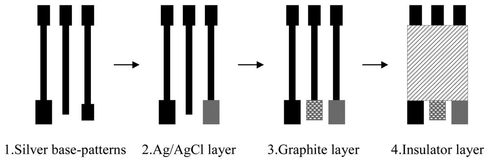 - Finally, excepting the surface of the three electrodes and the electrical connection at the reverse end of the sensor strip, an insulator layer was printed over the sensor strip and then cured by UV radiation.