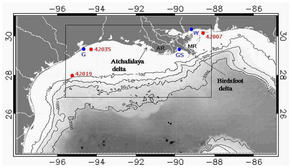 The study area located in the Gulf of Mexico extends from 27-30.5° N latitude, 88.2-95.5° W longitude and includes coastal and oceanic waters off the coastal states of Mississippi, Louisiana and part of Texas (Figure 1, rectangular inset). Seasonal discharge from the Mississippi and Atchafalaya Rivers through the birdsfoot and Atchafalaya deltas results in a major region of freshwater influence along the coasts of Mississippi, Louisiana and Texas. Additional outflows from the bays and smaller rivers can also contribute to a lesser extent biogenic material and sediments to the inner shelf. High river discharge and the outbreak of cold fronts over the coastal region characterized the 23-28 March 2005 period considered in this study. Satellite data, model results and field data from tide gauges and NDBC buoys (significant wave height) in Figure 1 are considered in this study.