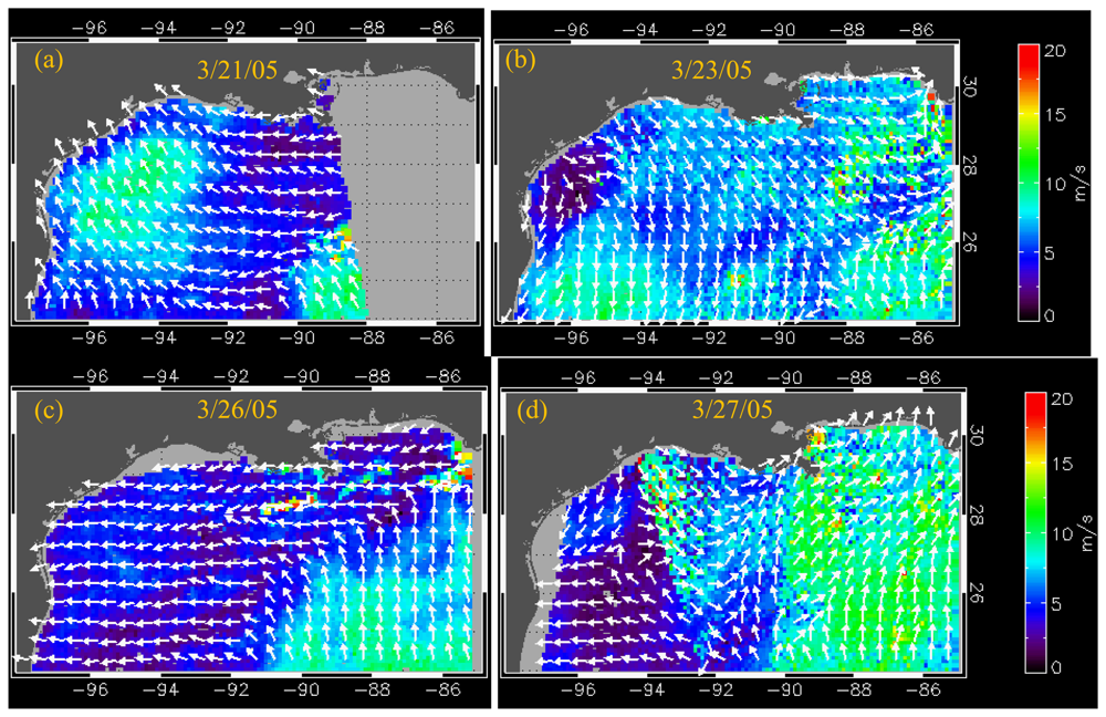 The prevalent winds observed before the passage of a weak cold front on 23 March 2005 (Figure 2b) were predominantly easterly as indicated by the QuikSCAT wind field on 21 March 2005 (Figure 2a). Following the weak frontal passage, easterly winds again prevailed over the northern Gulf (Figure 2c) that was followed by the passage of a much stronger front on 27 March with winds speeds up to about 17 m s-1. Figure 2d provides a snapshot of the frontal system as it moved southeastward at an oblique orientation to the coast due to an eastward-migrating low-pressure system (Georgiou et al. 2005). Frontal passages are accompanied by a systematic shift in wind direction, atmospheric pressure and a large drop in air temperature (Roberts et al. 1987). In this study for the first time the latest 12.5 km QuikSCAT wind product has been used to provide a more synoptic view of the wind field associated with the frontal passages. Winds were strong and to the southwest reaching values of up to about 17 m s-1 at the boundary of the front. The front extended offshore for about 200 km from the coast being strongest nearshore and decreasing offshore. A similar pattern was observed in the COAMPS winds (not shown) that were applied for surface forcing of the MsLaTex coastal model.