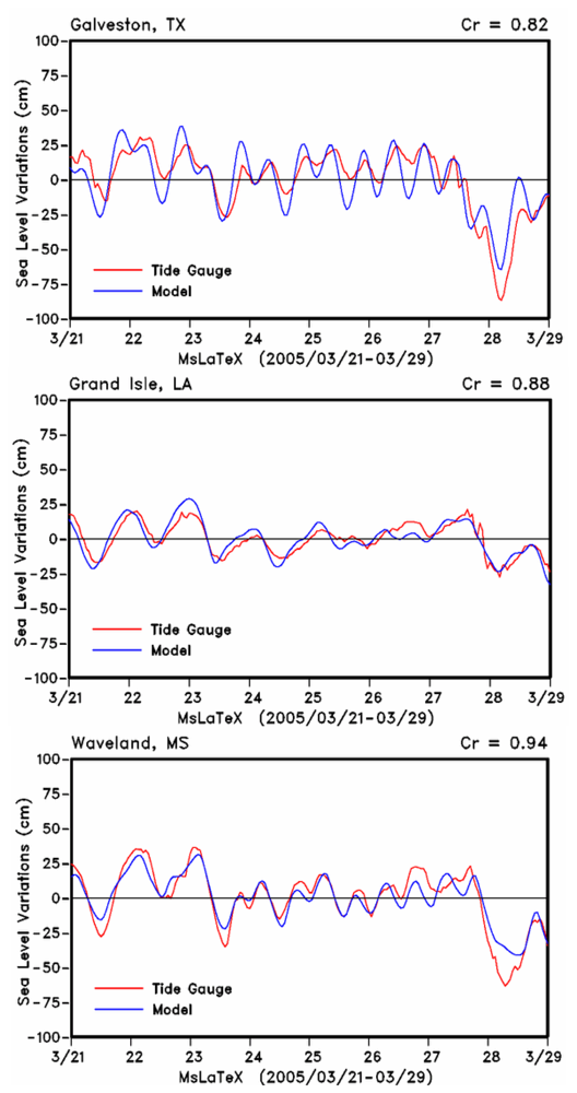 Sea level variations from model simulations (blue line) and tide gauge observations (red line) at (a) Galveston, Texas, (b) Grande Isle, Louisiana and (c) Waveland, Mississippi (shown in Fig. 1b) for the period 21-29 March 2005 corresponding to the frontal passages.