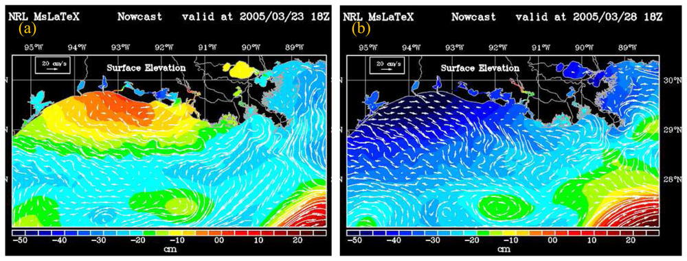 The Navy Coastal Ocean Model (NCOM) is a hybrid sigma-z vertical coordinate system based on the POM model that uses a nested modeling approach (Martin 2000; Ko et al. 2008). The high resolution Louisiana-Mississippi-Texas (MsLaTex) coastal model used in this study is nested within and receives boundary conditions from the regional 1/24° (∼6 km) horizontal resolution NCOM circulation model (Intra Americas Sea Nowcast/Forecast System or IASNFS) in operation for the Gulf of Mexico (e.g., Figure 2), the Caribbean, and parts of the western North Atlantic Ocean (Ko et al. 2003). The IASNFS regional model which assimilates real-time sea surface height anomaly data from three satellites (GFO, Jason-1 and ERS-2) and sea surface temperature data from AVHRR has been shown to produce realistic ocean circulation and sea level variations in the Gulf of Mexico and adjacent oceanic regions (Ko et al. 2003). The nested 372 × 200 grid MsLaTex model has 1/72° (∼ 1.9 km) horizontal resolution and vertical resolution of 19 layers on the shelf and 36 offshore. It spans the region between 27-30.5° N latitude and 88.2-95.5°W longitude (Figure 1, inset) that encompasses the Gulf coast states of Mississippi, Louisiana and Texas and includes shelf and oceanic waters in the northern Gulf of Mexico. Three hourly wind stresses, sea level air pressure and surface heat fluxes including solar radiation are applied for surface forcing from the Navy's Coupled Ocean/Atmosphere Mesoscale Prediction System (COAMPS) and the Fleet Numerical Meteorology Center (FNMOC). The model used the daily river discharge from the United States Geological Service (USGS) stations. The MsLaTex coastal ocean nowcast/forecast system is being developed to provide a 2-day forecast of sea-level, 3-d salinity, temperature and currents and has been run from 2002 with 3-hourly outputs of modeled results. In this study we examine selected model results on 23 and 28 March 2005 of sea level and surface currents of the study area during a frontal passage. Model derived sea level results are compared to tide gauge measurements at three tide gauge locations in Galveston (Texas), Grand Isle (Louisiana) and Waveland (Mississippi) (Figure 1) to assess the performance of model results with field data.