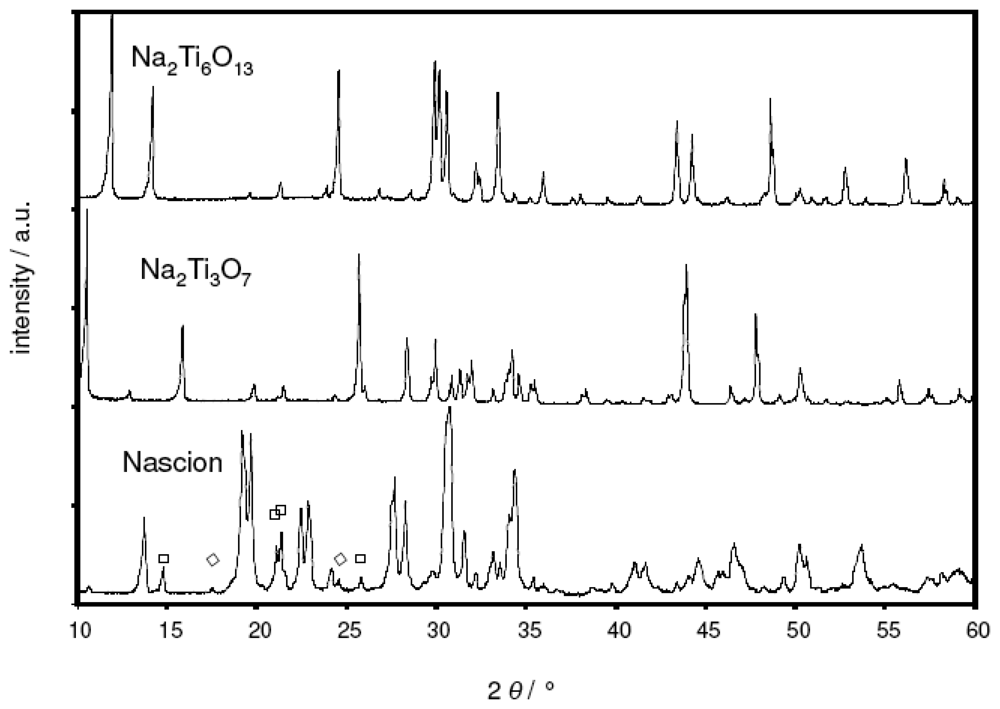 Two reference compositions were tested in the present study. The “sodium-rich” reference consisted of a Na2Ti6O13/Na2Ti3O7 (molar ratio: 1:1) mixture, while the “sodium-poor” composition was formed by mixing Na2Ti6O13 and TiO2 powder with a molar ratio of 1:1.