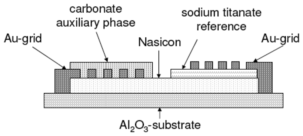 2 reference was printed on one side of the Nasicon film and fired at 950 °C for 5 h. Two gold grid electrodes were printed according to