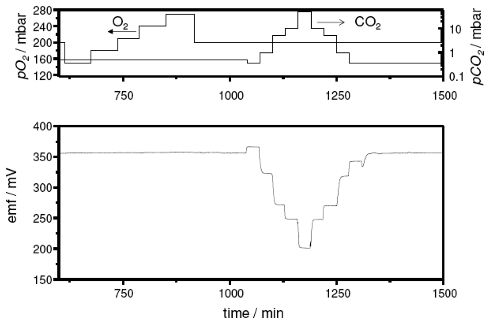 pCO2 was varied stepwise between 0.4 mbar and 45 mbar. The spikes that occur consistently between the 13.5 mbar and the 9 mbar step are an artifact related to the gas dosage system of the test bench. In order to access low