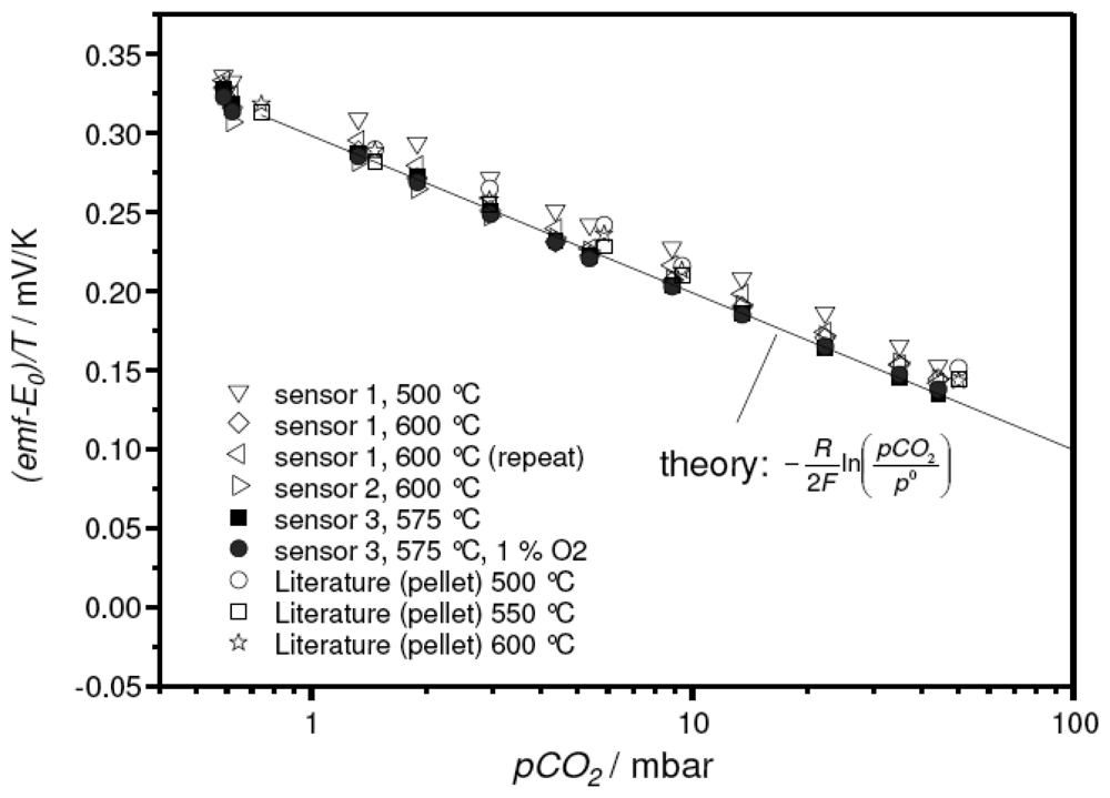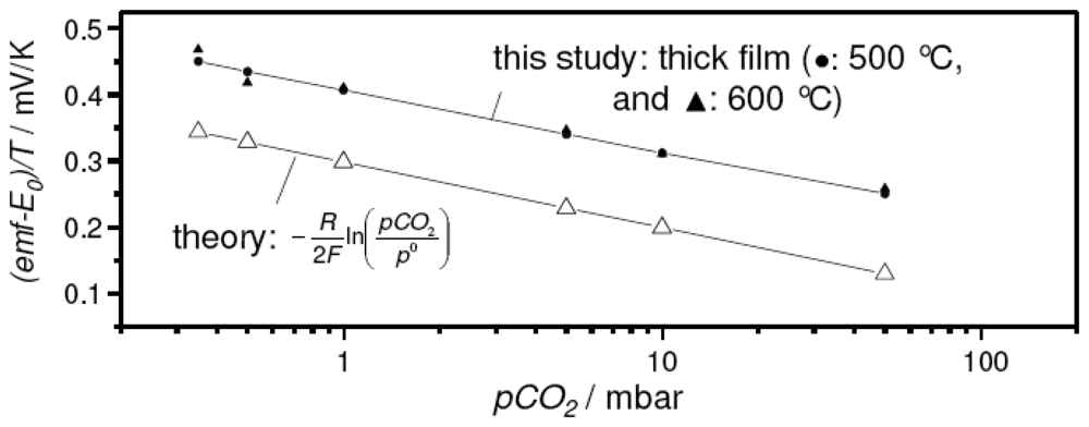 Figure 4, this deviation between pellet-type sensor (open symbols) and the corresponding thick-film device measured in the present study (closed symbols) is presented. In this case, the temperature-corrected form of the Nernst equation (