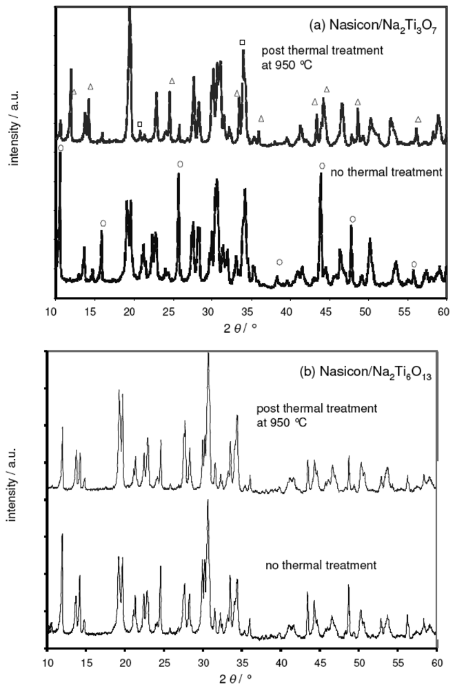 The XRD pattern after thermal treatment indicated a thermally activated reaction between the Nasicon and the titanate. The characteristic peaks of Na2Ti3O7 (symbol ○ in the bottom figure) are almost completely replaced by the sodium-poor Na2Ti6O13 phase (symbol Δ). In addition, changes in the Nasicon pattern are observed, e.g., the double peak at 19° is reduced to one broadened peak. This might be attributed to a compositional and structural change of the sodium ion conductor from Nasicon to Na4Zr3Si3O12. As an additional phase, Na3PO4 is found (symbol □).
