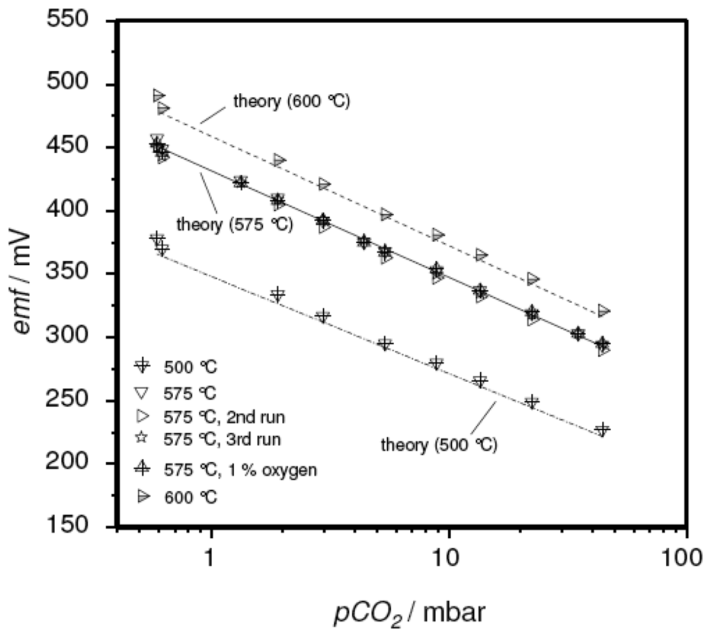 As known from the cell reactions (1) and (2), the theoretical electron transfer number equals 2. With the present sensor set up, values of 2.14 ± 0.06 (total of 4 specimens, each measured 3 times at 500 °C) and 2.12 ± 0.06 (total of 4 specimens at 600 °C) were determined.