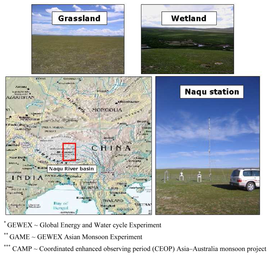 In the Naqu river basin a meso-scale network of meteorological stations has been installed in the framework of the GEWEX* sponsored GAME**/Tibet and CAMP***/Tibet field campaigns, of which Naqu station is equipped with the most extensive set of field instruments (e.g. radiation and eddy correlation instrumentation). This station is located near Naqu city at a latitude and longitude of 31.36 and 91.89 degrees (WSG84), respectively. The Naqu station and its vicinity have been selected as the focal point for this study.