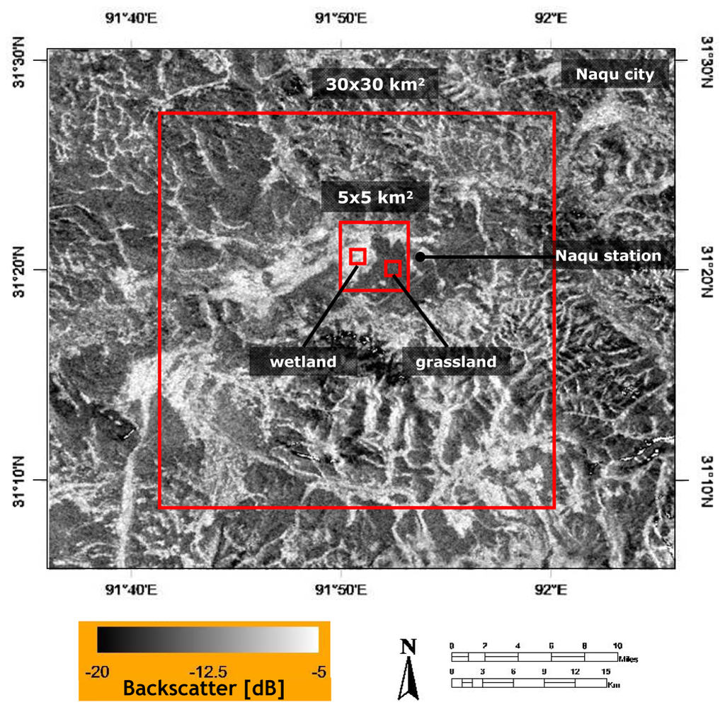 Differences in the land cover and seasonal weather cause soil moisture conditions to be spatially and temporally variable in the area around Naqu station. To investigate the impact of these soil moisture dynamics on σo signatures and its spatial variability, four different study domains have been selected, which have areas of: 30×30 km2, 5×5 km2 and 1×1 km2. The 30×30 km2 and 5×5 km2 domains are covered by a mixture of grassland and wetland, while for the 1×1 km2 domain a grassland and wetland have been selected. The areas have been selected in such way that the 5×5 km2 domain is included in 30×30 km2 domain, and the 1×1 km2 domains are included in the 5×5 km2 domain as is shown in Figure 2.