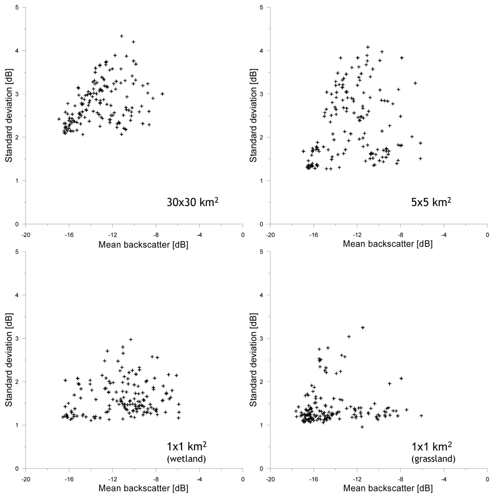 For each of the four domains, a well-defined and linear relationship exists between the mean σo and maximum stdev at specific σo levels and its slope could be seen as measure for the surface heterogeneity of a specific domain. Steeper slopes indicate a larger surface heterogeneity. For the 5×5 km2 domain, the slope is steepest and its surface heterogeneity may be considered to be the largest of the four domains. This is, however, also influenced by the distribution of wetlands and grasslands in the selected areas, because differences in land surface conditions between wetlands and grasslands persist, specifically during the monsoon. The similarity between the slopes in plots of the 30×30 km2, and 1×1 km2 wetland and grassland domains is striking and suggests a similarity in the surface heterogeneity between these areas. Additionally, it should be noticed that for the grassland domain the number of data points with a high stdev is small. Soils in the grasslands are sandy and have a high hydraulic conductivity. Over short time periods, soil moisture is transported from the top to deeper soil layers. Spatial variations due to dry-down cycle diminish, therefore, quickly and are difficult to capture by observations acquired at a 6-day temporal resolution.