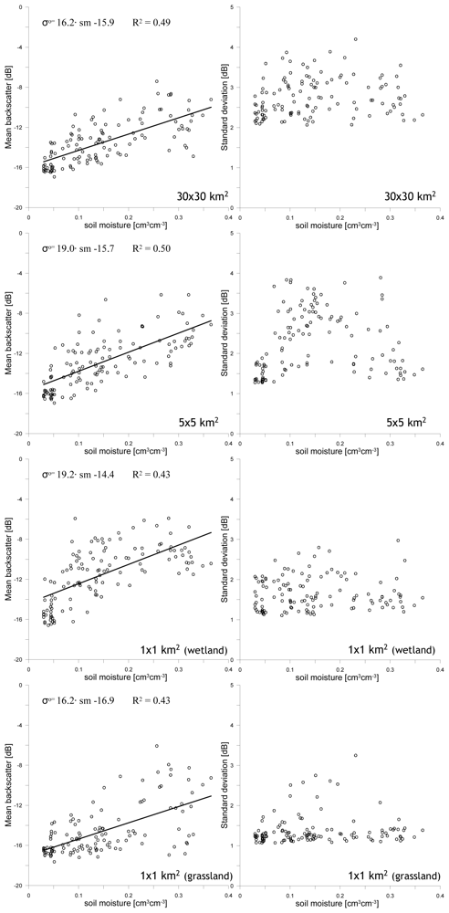 In the previous section, the impact of land surface processes on the relationship between the mean σo and the stdev is described. Within this discussion the magnitude of the mean σo is implicitly assumed to be representative for the local soil moisture conditions and the σo stdev is utilized as indication for the spatial soil moisture variability. A robust validation of these assumptions would require intensive soil moisture sampling across the spatial domains over a long time period. Unfortunately, such data set is not available for the selected study area. However, at Naqu station an almost continuous time series of soil moisture measurements has been collected during the period in which ASAR observations were collected. These soil moisture measurements are plotted against the mean σo and stdev for the four spatial domains, which is shown in Figure 5. Linear regressions functions of the form σo = a · soil moisture+ b have been computed and are presented in the plots. Statistics related to these regression functions are given in Table I.