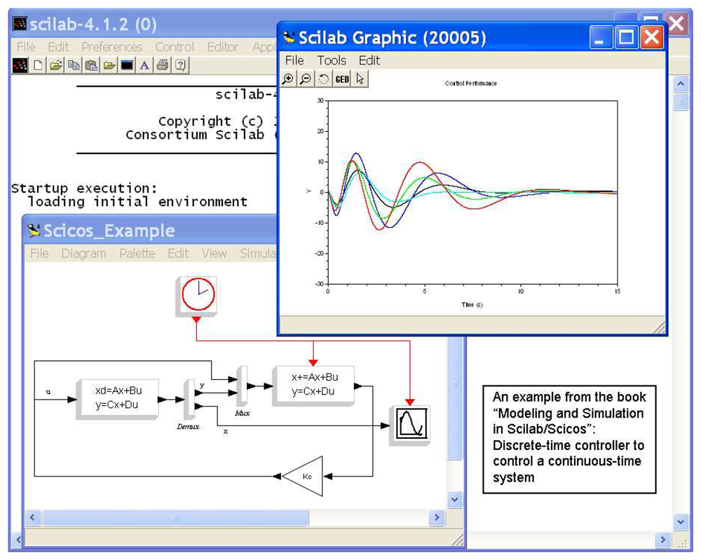 Scilab provides hundreds of built-in powerful primitives in the form of mathematical functions. It supports all basic operations on matrices such as addition, multiplication, concatenation, extraction, and transpose, etc. It has an open programming environment in which the user can define new data types and operations on these data types. In particular, it supports a character string type that allows the online creation of functions. It is easy to interface Scilab with Fortran, C, C++, Java, Tck/Tk, LabView, and Maple, for example, to add interactively Fortran or C programs. Scilab has sophisticated and transparent data structures including matrices, lists, polynomials, rational functions, linear systems, among others. It includes a high-level programming language, an interpreter, and a number of toolboxes for linear algebra, signal processing, classic and robust control, optimization, graphs and networks, etc. In addition, a large (and increasing) number of contributions can be downloaded from the Scilab website. The latest stable release of Scilab (version 4.1.2) can work on GNU/Linux, Windows 2000/XP/VISTA, HP-UX, and Mac OS.