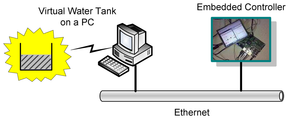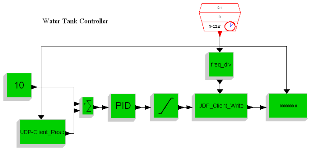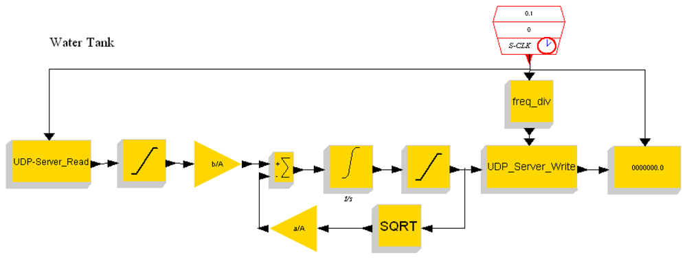 In this section we conduct experiments on the developed embedded control platform. A water tank controller is implemented. The setup of the experimental system is shown in Figure 11. For simplicity the water tank is simulated by a PC running Scilab/Scicos. The PC and the embedded controller are connected using Ethernet. The Scicos models of the water tank running on the PC and the controller running on the ARM-Linux system are depicted in Figures 12 and 13, respectively.