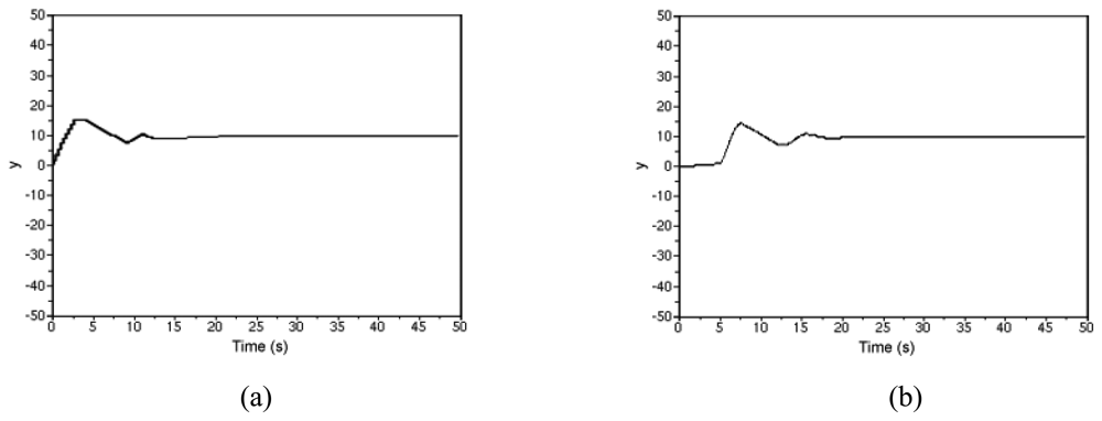 The control performance of the system is shown in Figure 14, where the system output (denoted y) is given for different sampling periods, i.e., h = 0.1s and 0.5s, respectively. It is seen that the control system delivers quite good performance, especially when the sampling period is 0.1s. In both cases, the water level successfully reaches the desired value (i.e. 10 in the experiment) and remains steady after a transient process.