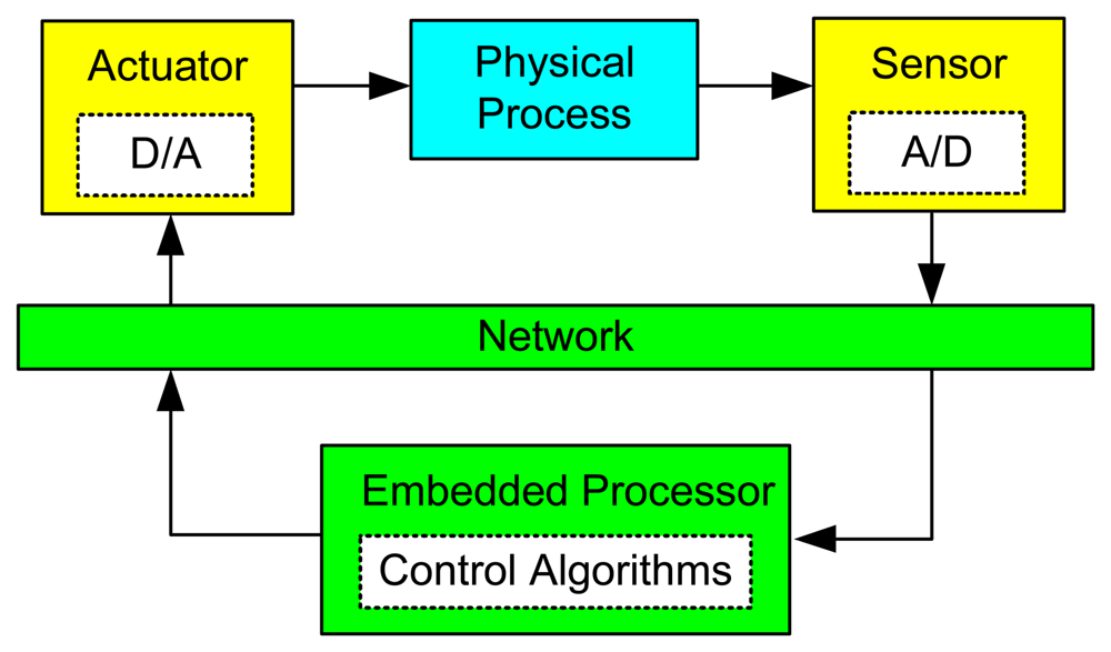 As control systems increase in complexity and functionality, it becomes impossible in many cases to use analog controllers. At present almost all controllers are digitally implemented on computers. The introduction of computers in the control loop has many advantages []. For instance, it makes possible to execute advanced algorithms with complicated computations, and to build user-friendly GUI. The general structure of an embedded control system with one single control loop is shown in Figure 2. The main components consist of the physical process being controlled, a sensor that contains an A/D (Analog-to-Digital) converter, an embedded computer/controller, an actuator that contains a D/A (Digital-to-Analog) converter, and, in some cases, a network.