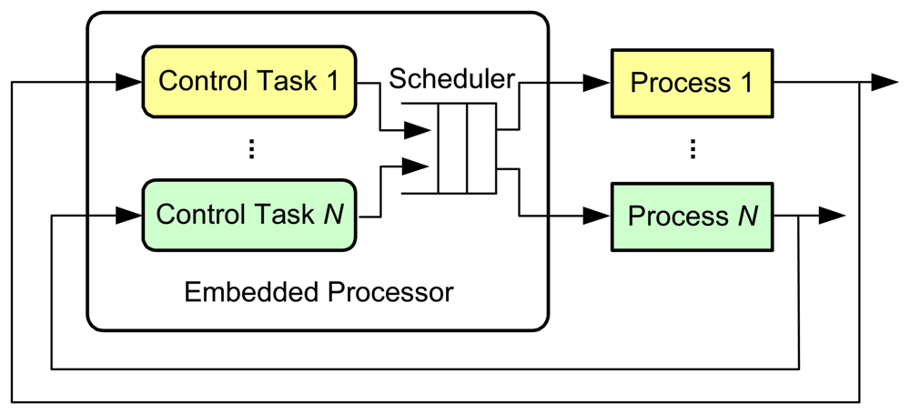 The most basic operations within the control loop are sensing, control, and actuation []. The controlled system is usually a continuous-time physical process, e.g. DC motor, inverted pendulum, etc. The inputs and outputs of the process are continuous-time signals. The A/D converter transforms the outputs of the process into digital signals at sampling instants. It can be either a separated unit, or embedded into the sensor. The controller takes charge of executing software programs that process the sequence of sampled data according to specific control algorithms and then produce the sequence of control commands. To make these digital signals applicable to the physical process, the D/A converter transforms them into continuous-time signals with the help of a hold circuit that determines the input to the process until a new control command is available from the controller. The most common method is the zero-order-hold that holds the input constant over the sampling period. In a networked environment, the sequences of sampled data and the control commands need to be transmitted from the sensor to the controller and from the controller to the actuator, respectively, over the communication network. The network could either be wireline (e.g. fieldbus, Ethernet, and Internet) or be wireless (e.g. WLAN, ZigBee, and Bluetooth). In a multitasking/multi-loop environment, as illustrated in Figure 3, different tasks will have to compete for the use of the same embedded processor on which they run concurrently.