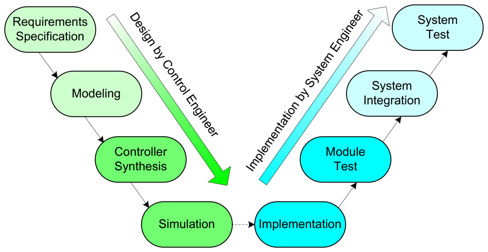 Traditionally, the development cycle of a control system consists of two main steps: controller design and its implementation. These two steps are often separated [, ], as shown in Figure 4, where the so-called V-model is given. While the controller design is usually done by control engineers, the implementation is the responsibility of system (software) engineers. In the first step, the control engineers model the physical processes using mathematical equations. According to the requirements specification, the control engineers then design the control algorithms. The parameters of the control algorithms are often determined through extensive simulations to achieve the best possible performance. A widely used tool in this step is Matlab/Simulink that supports modeling, synthesis, and simulation of control systems. In this environment the physical processes are usually modeled in continuous time while the control algorithms are discretized to facilitate digital implementation. In the second step, the software engineers produce the programs executing the control algorithms with the parameters designed in the first step. There are a number of mature programming languages available for the implementation. The system will be tested, possibly many times before the satisfactory performance is achieved.