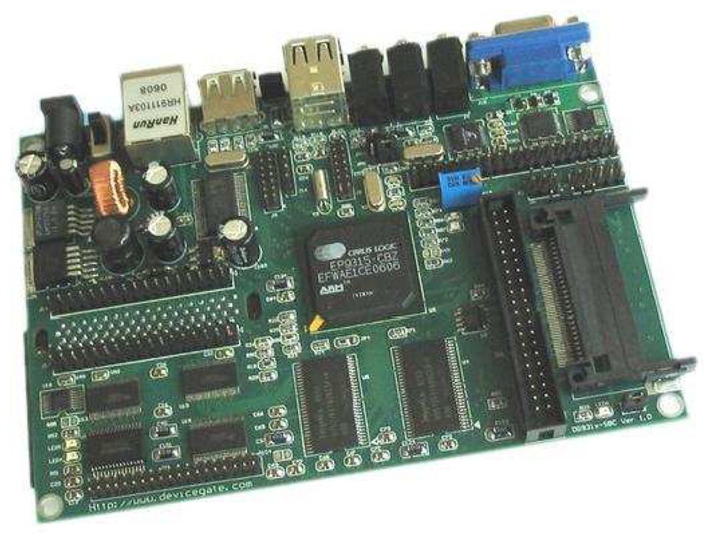 The development board used in this work is based on the EP9315 processor from Cirrus Logic, as shown in Figure 7. The EP9315 [] is a highly integrated system-on-chip processor for consumer and industrial electronic products. It features an advanced 200 MHz ARM920T processor design with a memory management unit, separate 16KB instruction cache, 16KB data cache, 64MB SDRAM, and 32MB flash memory. Linux, Windows CE and many other embedded operating systems are supported. The ARM920T has a 32-bit microcontroller architecture, along with a five-stage pipeline, and is capable of delivering impressive performance at very low power.