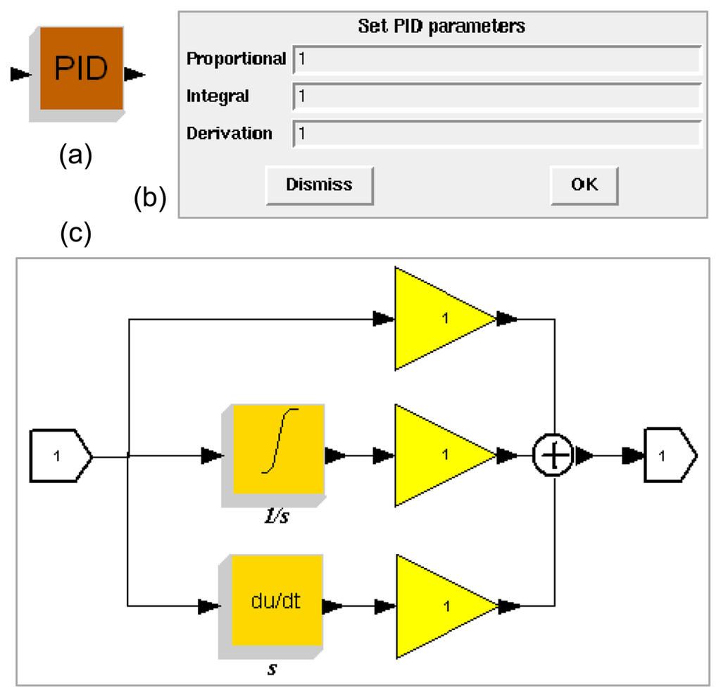 As a simple example, Figure 8 shows the implementation of a PID controller in Scicos []. The PID control algorithm involves three critical parameters, i.e., the Proportional, Integral and Derivative values. The proportional component determines the response to current error. The integral component determines the response with respect to the sum of recent errors. The derivative component determines the response to the change rate of the error. The user can set these three parameters on the dialog box shown in Figure 8(b). The algorithm can be implemented as a (basic) block, see Figure 8(a), or a subsystem that is composed of a number of interconnected blocks, see Figure 8(c).