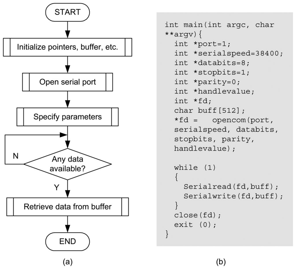 Procedures to retrieve data from serial port. (a) Flow chart; (b) Code.