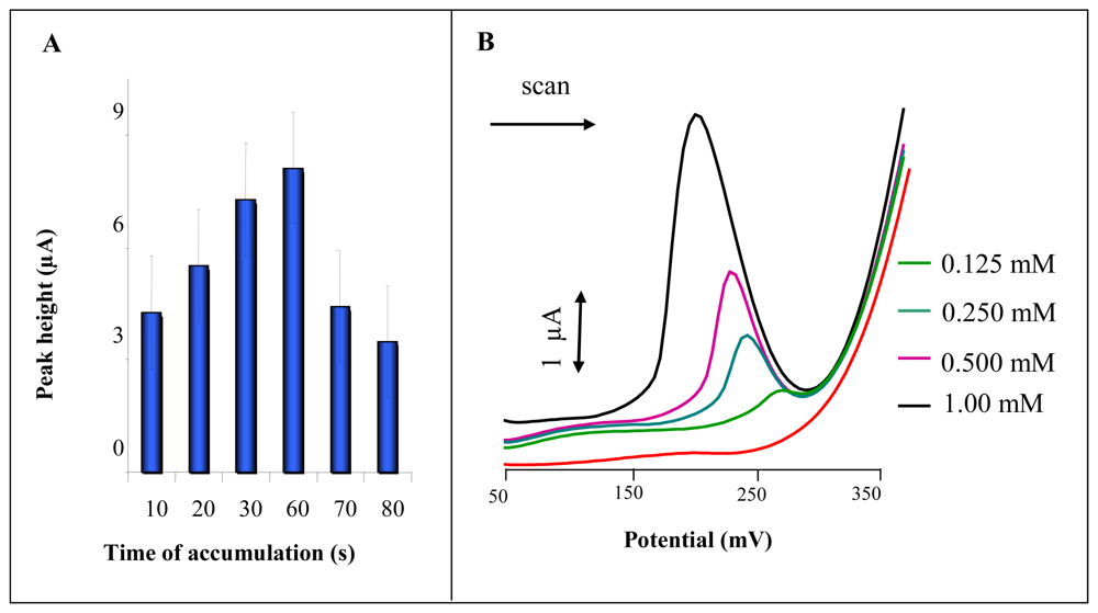 The CPE modified by solid silver (I) nitrate didn't give a signal in the presence of Britton-Robinson buffer (pH 1.8) only (not shown). Signal detected using modified CPE probably relates to formation of AgCl and its dissociation. Chlorides can be also adsorbed on the mercury electrode surface at +100 mV under formation of products with mercury similarly to silver electrodes surface. It was generally considered that this bond is too strong to be pure sorption. Their common superficial concentration is about 1.5 nmol/m2 [, ]. Therefore we tested the influence of accumulation of AgCl on the surface of modified CPE. Differential pulse voltammetric analysis was initiated by the accumulation of reaction product at potential +250 mV. The quantity of accumulated product increased with the time of accumulation up to 60 s, and then the signal declined (Figure 2A). The dependence of peak height on NaCl concentration within the range from 125 μM to 1 mM was studied (Figure 2B). The obtained signals were well developed and decreased from 1.2 μA to 0.2 μA with decreasing concentration of chloride ions. Potential of peak shifted to more positive potentials from 218 to 290 mV. Limit of detection (3 S/N) was estimated as 100 μM NaCl.