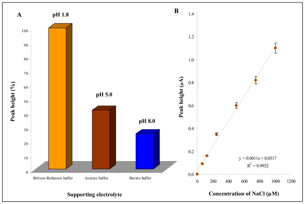 Electrochemical analysis of chloride ions using CPE modified with silver microparticles. (A) Effect of type of supporting electrolyte (Britton-Robinson, Acetate and Borate buffer) on chloride ions response. (B) Calibration curve.