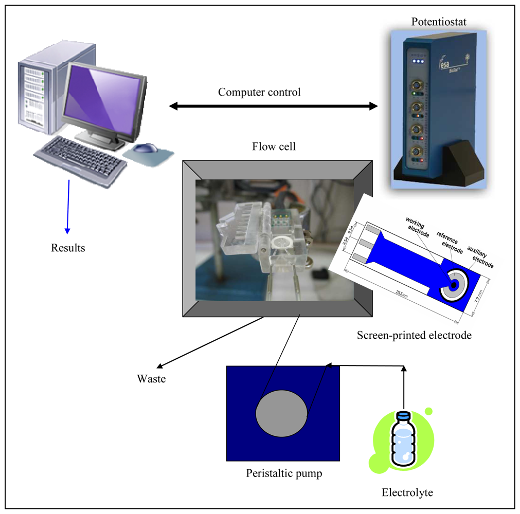 After we successfully optimized the modifications of CPEs which were connected to a standard laboratory potentiostat, we approached the miniaturization of the whole electrochemical instrument. The measurements were carried out on miniaturized instrument consisted of a Biostat potentiostat with dimensions 35 × 166 × 125 mm, screen printed electrodes, a peristaltic pump and a PC with control software (Figure 5). The electrochemical flow cell was connected to the peristaltic pump via capillary tubing. The pump introduced the supporting electrolyte and samples. Screen printed electrodes with silver electrode as working one were inserted into the cell. The electrodes were connected to miniaturized potentiostat controlled by PC, where electrochemical responses were recorded. To obtain well repeatable responses full immersing of screen printed electrodes was needed.