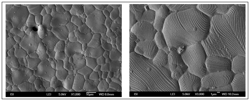 Surface electron microscopic microphotograph of silver working electrode surface (left), in detail (right).