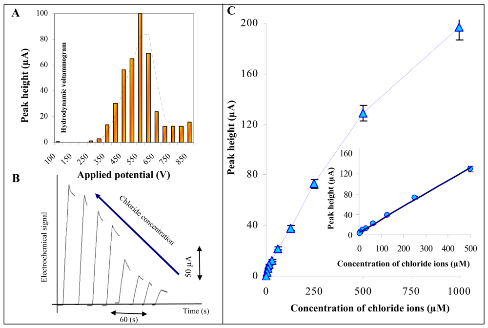 Chloride ion detection using screen printed electrodes. (A) Hydrodynamic voltammogram of chloride ions (100 μM). (B) Amperometric signals of chloride ions (1000, 500, 250, 125, 63, 32, 15 and 7 μM). (C) Calibration curve.