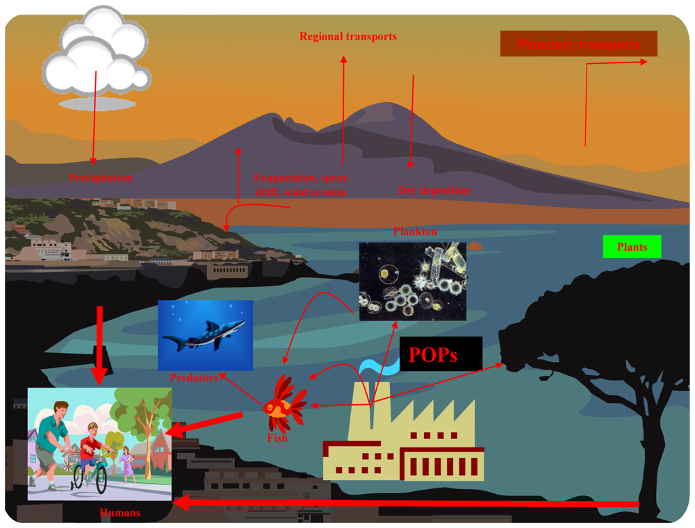 Schematic of the POP cycle in the environment. POPs are released from local sources and transported via atmosphere. They enter locally into water ecosystems (particularly plankton); plankton is subsequently consumed by fish. Predators including humans are also affected because they stand in the top of food chain. The second way is surface contamination of plants.