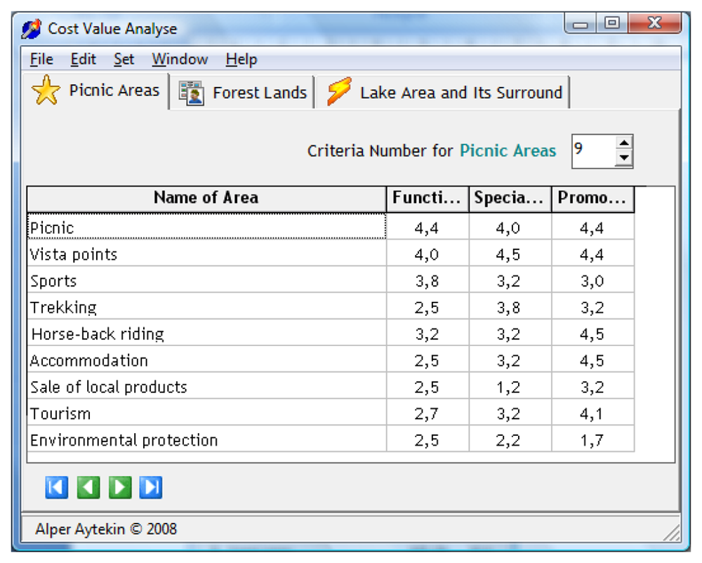 One of the key targets of forestry is to have multiple values. In other words, it attempts to utilize the products and services that forests provide together and in the same area. The importance of recreational activities, rest and the recreation concept itself has been increasing with leisure time, which is an indispensable part of individual lifestyles. The determination of the importance level of multiple value options of the area is the main step of specifying the purpose. The reason why the Bolu-Lake Abant Natural Park (BLANP) was selected a case study is that it has been divided into three options, identified as “picnic areas”, “forest lands” and “lake and its environs”. An evaluation and the flow sheet of analysis of related options and criteria have been explained with the aid of figures and tables. In addition, the software developed has been introduced by screen captures. The software has been written n Delphi® 2006 programming language. The minimum requirements for the software are: Pentium (or above) processor, 512 MB of memory and Windows XP (or higher) operating system. The software is Windows Vista compatible and the data to be used can be transformed into various formats.