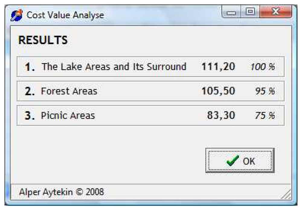 According to the methods developed by Altan [13] and Gulez [14], while actual recreation potential is determined subjectively, the priority of importance of the options and the criteria can objectively be determined by the software developed on the basis of the method proposed by Churchman and Ackoff [12]. The landscape value of an area can be determined precisely in a short time by means of the software.