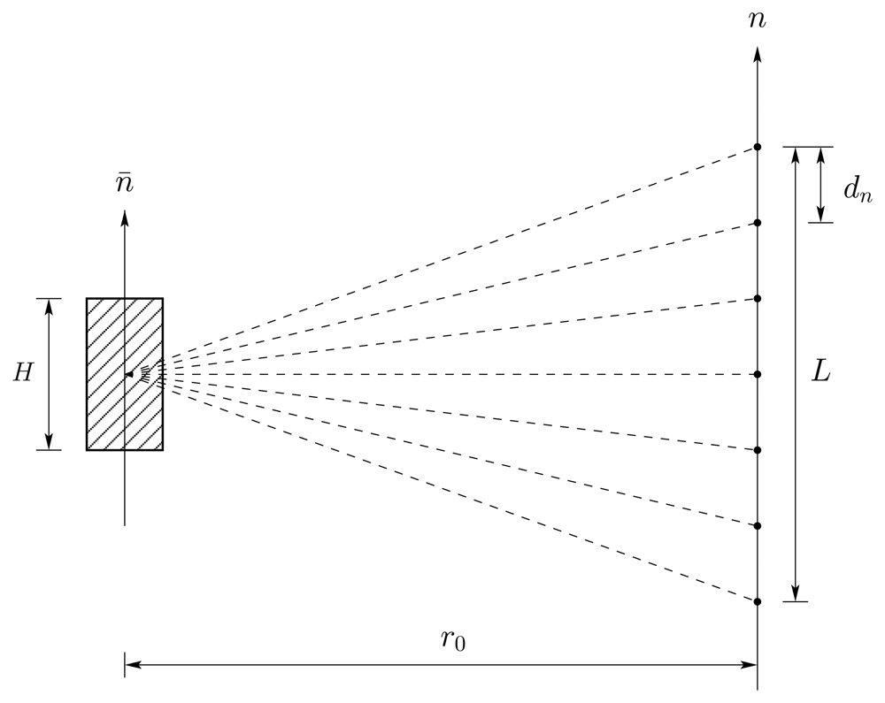 The simplified tomographic acquisition geometry that forms the basis for the derivation of the spatial resolution and the sampling constraints in normal direction n – i.e. orthogonal to the plane spanned by the slant-range direction and the azimuth direction – is depicted in Fig. 1. r0 is the range distance at the point of closest approach along the synthetic aperture in normal direction n. Equally spaced baselines dn are assumed and the variation of the off-nadir angle is neglected, so, the vector n⃗ in normal direction is assumed to be invariant for all acquisition paths. Target coordinates are identified by a bar above the symbol. Assuming that the synthetic aperture in the normal direction n is continuous - imagine an infinite number of single look complex images, represented by sr, acquired from an infinite number of different, parallel flight tracks along n - the focused signal in normal direction υ (n̄0) at position n̄0 in the object space can be written as the following convolution in the time domain: