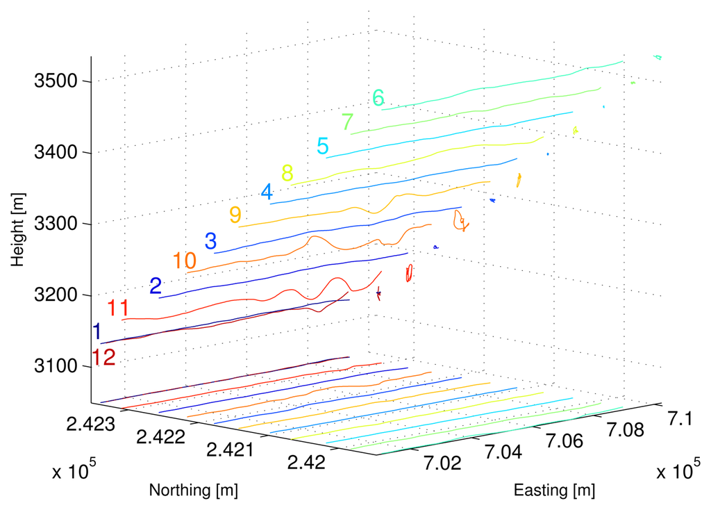 The 12 P-band data sets were acquired within one air mission. The maximal time span between the first and the last track is approximately 2 h. The tracks of the tomographic pattern were flown in an interleaved manner in case that an unexpected incidence would have caused an untimely abortion of the data acquisition. In Fig. 2 the geometric configuration of the flight tracks for the P-band tomographic data set is shown. The flight direction is from east to west and the sensor is left-looking. In addition to the actual flight tracks, their projections to the horizontal plane and to the northing-height plane are also depicted. The mission was completed by a control track which has the same nominal flight geometry as the first track. This allows assessing the amount of temporal decorrelation between the first and the last track. Table 2 contains a summary of the parameters which characterize the tomographic data set.
