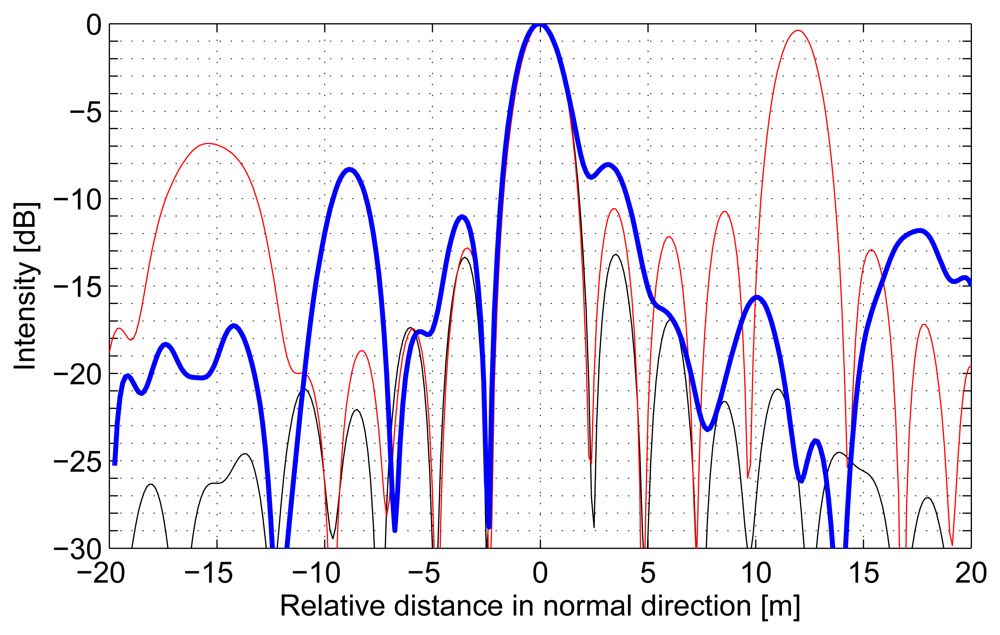 In Fig. 3 the respective impulse responses resulting from TDBP tomographic imaging in the normal direction are given for the three cases: a single simulated point target (black line), two simulated point targets which are separated by a distance of 12 m in normal direction (red line), and a real, in-scene corner reflector (blue line). The simulated data is based on exactly the same geometry as in the real situation. In all cases the point targets are focused properly in terms of resolution (δn ≈ 3 m). But, the focused signal of the two simulated point targets aligned along the normal direction exhibits a rather strong ambiguous target detection and the focused signal of the in-scene corner reflector shows a considerable amount of anomalous side lobes.