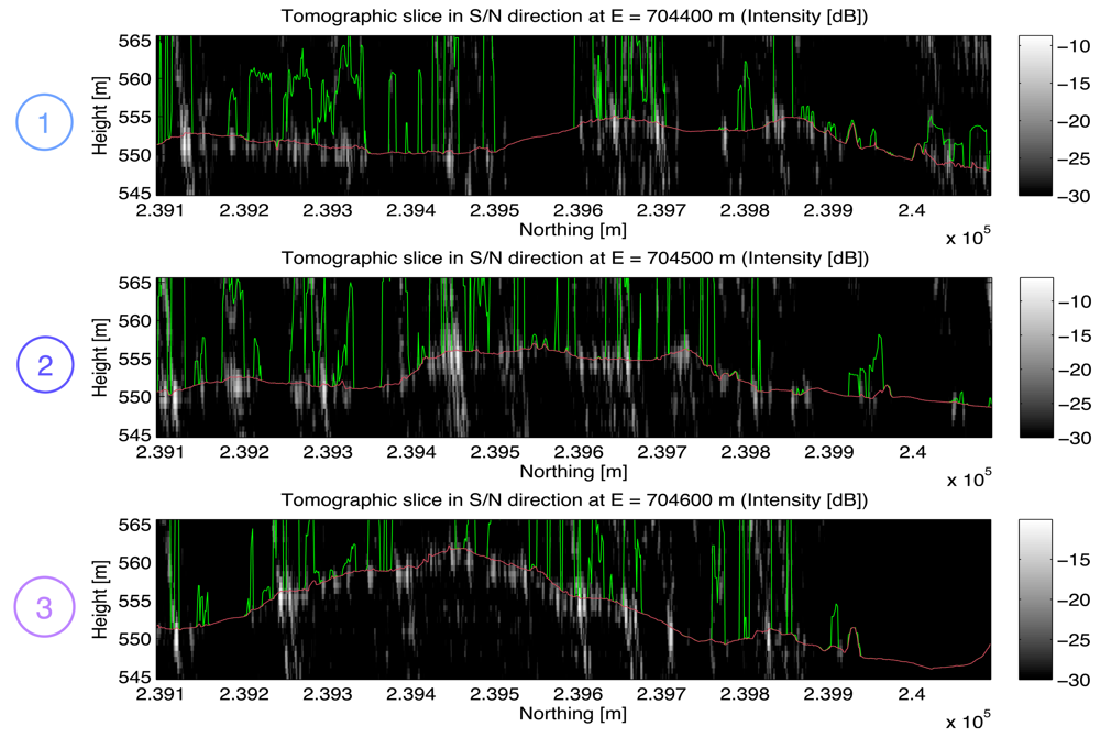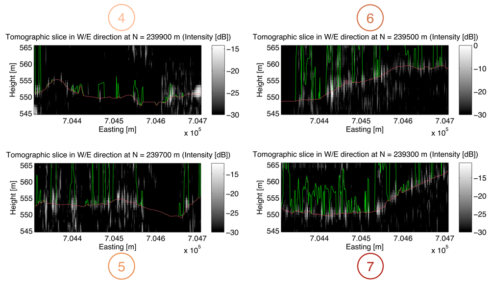 Seven vertical tomographic slices of the imaged volume separated by a regular spacing have been selected for visualization: In Fig. 5 three slices (No. 1-3) running in south-northern direction at easting values E = 704400 m, E = 704500 m, and E = 704600 m are depicted and in Fig. 6 four slices (No. 4-7) running in west-eastern direction at northing values from N = 239300 m to N = 239900 m are given. For smoother visualization the data have been upsampled in the vertical direction by a factor of 2 after focusing. The tomographic slices represent the measured radar intensity values in dB. The red and the green lines indicate the reference height information obtained from the laser DEM or DSM, respectively.