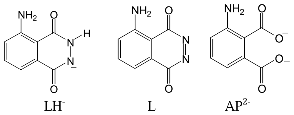 Structures of luminol (LH-), its oxidized form (L) and lumophoric product (AP2-).