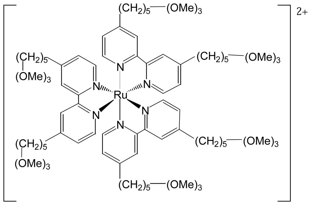 In an additional report by Lee et al., [Ru(bpy)3]2+ was modified with –Si(OMe)3 groups on each ligand (Figure 3). After hydrolysis of the silicate groups, a thin, porous polymer film was immobilized on an ITO (indium-tin oxide) electrode. The reason for choosing ITO as the electrode material was that the hydroxyl groups on its surface would also bound with the modified [Ru(bpy)3]2+ through –Si—O— bonds. The film was very stable, even after long-term exposure to acetonitrile [11].