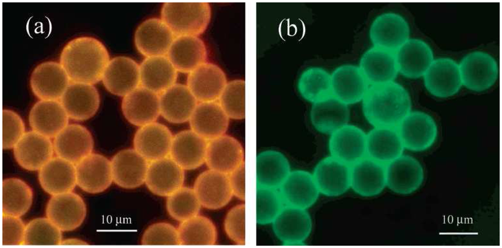 Fluorescent images (λex 490 nm, exposure time 30 s) of carboxylate polystyrene beads: (a) after entrapment of Ru(bpy)3[B(C6F5)4]2 and (b) after covalent binding of avidin to the surface. Reproduced with permission of ACS [51].