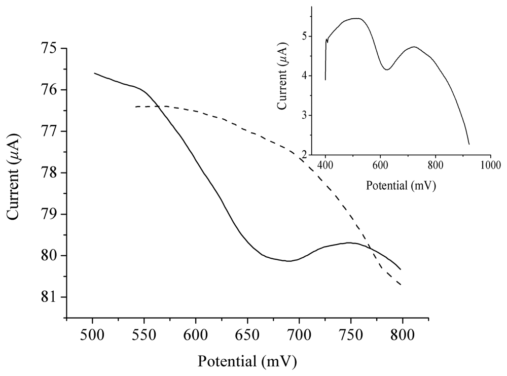 Square wave voltammograms of hIAPP at the concentration of 2.5×10-5 M (solid line) and 0 M (dashed line). Inset is the square wave voltammogram of tyrosine solution at the concentration of 2×10-6 M.