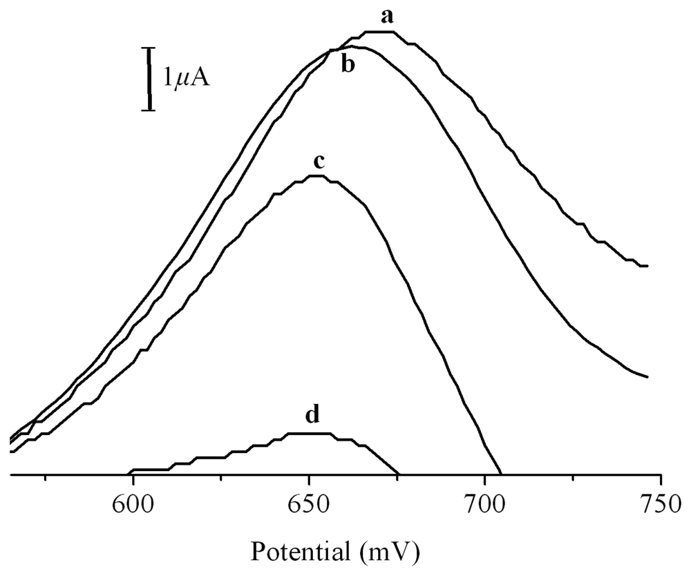 Square wave voltammograms of 5.1×10-5 M hIAPP incubated at 37 °C for (a) 0 h, (b) 1 h, (c) 2 h and (d) 5 h.