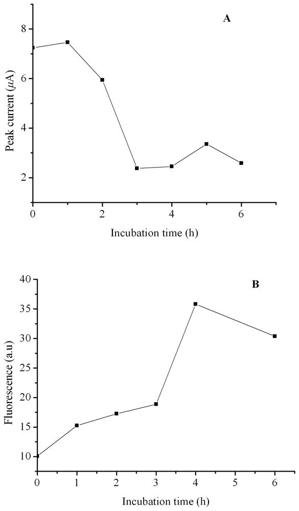 Figure 4(A) shows the relationship between the oxidation peak current and the incubation time (R.S.D.: 0.73% ∼ 2.02% for three measurements). During the incubation period the peak current is nearly unchanged from 0 to 1 h. This result may be due to a multistep nucleation-aggregation and concentration-dependent process that proceeds via a conformational transition of mainly random coil hIAPP into β-sheet-containing amyloid aggregates. At the beginning of the aggregation process, a nucleation period during which soluble oligo- and multimeric hIAPP are formed is necessary [10, 16, 33, 34]. This period may have little influence on the oxidability of the tyrosine residue in C-terminal of hIAPP. However, as the nucleating period is finished and multimeric hIAPP seeds are formed, a conformational transition process starts, accompanied by a rapid decrease of the free tyrosine residues. As a result, as shown in Figure 4(A), the peak current declined rapidly during the incubation period from 1 to 3 h. After the three hour incubation period, the peak current of hIAPP reaches a minimum and can be hardly changed with a further prolonged incubation period, which suggests that hIAPP has completed changed its conformation from a soluble monomer to amyloid aggregates within the three hours.