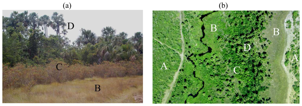 - Melack, J.M. Tropical freshwater wetlands. In Manual of Remote Sensing, Vol. 4: Remote Sensing for Natural Management and Environmental Monitoring.; JohnWiley and Sons: Hoboken, NJ, USA, 2004; pp. 319–343. [Google Scholar]