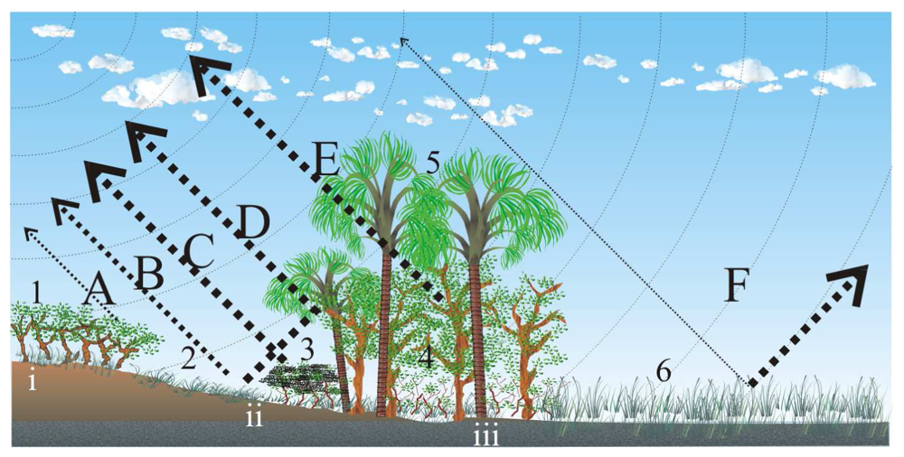The main mechanisms governing the interaction between SAR C-band signal and a vereda. Legend: 1) wooded savanna, 2) intermittently dry grasses, 3) shrub, 4) trees with a predominance of 5) Mauritia flexuosa L.f. and 6) permanently wet grasses, i) dry sandy soil, ii) hydromorphic, almost permanently moist soils, iii) the aquifer is permanently close to the surface. In A) the dry wooded savanna and dry soils have a low dielectric constant but a high scattering potential. In B) the grasses have a relatively high scattering power and can have a high dielectric constant when wet or when the soil is saturated. In C) and E) the shrub and trees growing on hydromorpic soils are good scatterers and are moist with a high dielectric constant. In D) the riparian forest is a good scatterers with a high dielectric constant and can act as a corner reflector on its margin. Finally, in F) flooded grasses cause most of the signal to be reflected away from the SAR antenna.