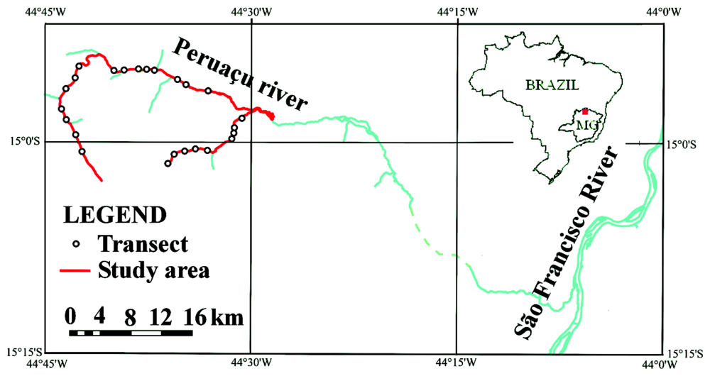 The study area is situated along the course of the Peruaçu river in Northern Minas Gerais - Brazil, in a region called Chapadão das Gerais. The area was chosen for being one of the rare well preserved regions of the Brazilian savanna having ideal environmental conditions for the research (being a protected area) and having some of the longest veredas areas of the country (Figure 3). The study area covers about 540 km2 and about 50 linear km of veredas. It also completely encloses the Veredas do Peruaçu State Park (≈ 31 km2). The Peruaçu river is a tributary of the São Francisco river, the third largest watershed of Brazil. The region's bedrock is composed of a layer of sandstone (usually highly weathered) over carbonates from the superior Proterozoic. The topography is mostly flat and slopes are very smooth. The climate is semiarid, with an average temperature of over 25°C. Precipitation averages 124 mm per month between October and April and less than 2 mm between May and September [34].