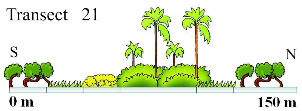 Example of graphically enhanced transect across a narrow stretch of vereda. Note the buriti palms in the center, bordered by shrub, grasses and wooded savanna successively.
