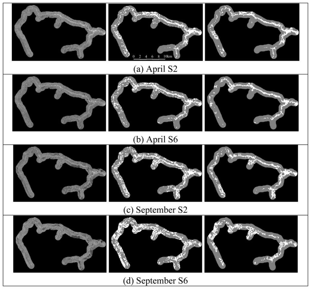 SAR images (left), classification results obtained with the MAMSEG algorithm for the two periods and the two incidence angles using 80 iterations (center) and classification results after they have been “cleaned” using the stream network and the contamination algorithm (right).