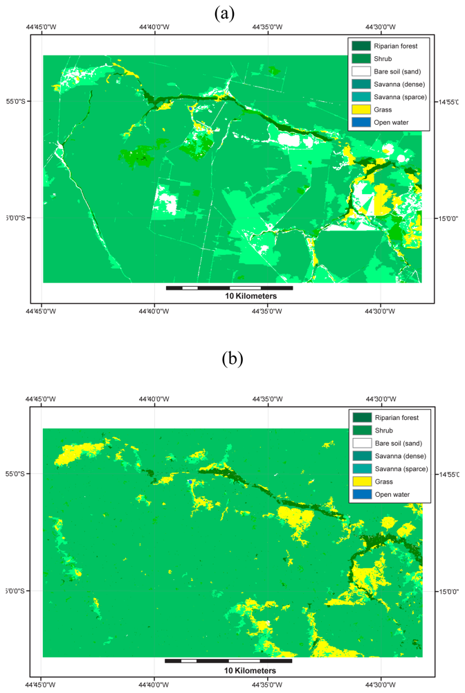 The difference in moisture suggests that, in terms of soil, grassland is more likely to be associated to the savanna than it is to the riparian forest. For this reason, two versions of the confusion matrix were built (Tables 3 and 4).